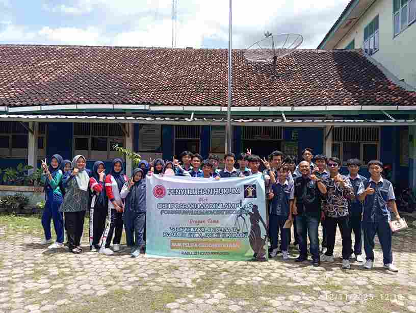 PESAWARAN(SB) – Maraknya kasus kejahatan dan kekerasan yang melibatkan anak di bawah umur mendorong Pos Bantuan Hukum Advokat Indonesia (Posbakumadin) Lampung untuk proaktif turun ke sekolah. Kali ini, kegiatan Penyuluhan Hukum dengan tema “Hukum Pidana Anak dan Kejahatan Digital” diselenggarakan di SMK Pelita Gedong Tataan, Rabu (12/11/2025).