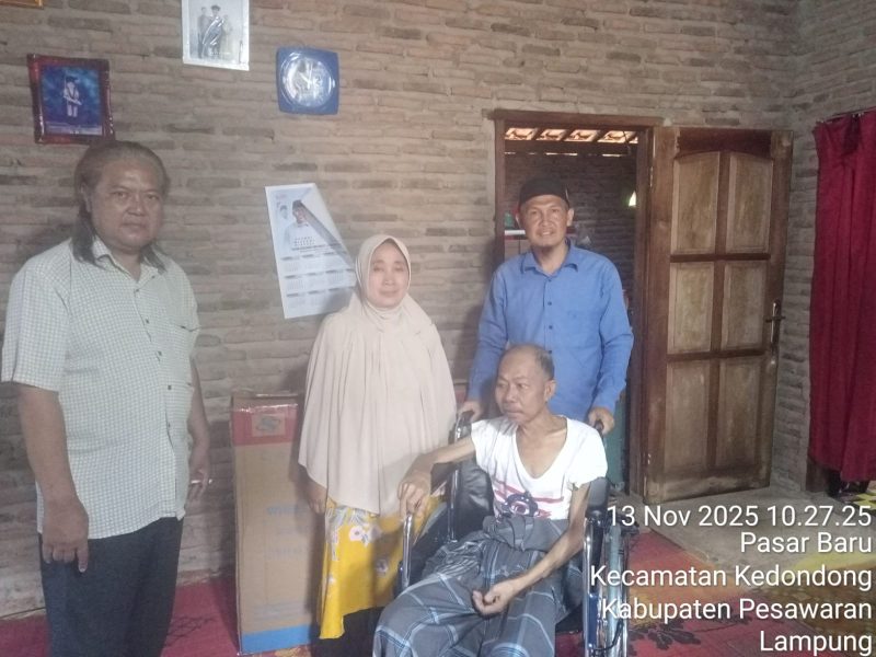 PESAWARAN(SB) – Sebagai wujud nyata kepedulian sosial, Dewan Pimpinan Daerah Lembaga Perlindungan Konsumen Swadaya Masyarakat (DPD LPKSM) Pesawaran bersinergi dengan Badan Amil Zakat Nasional (BAZNAS) Kabupaten Pesawaran menyalurkan bantuan kursi roda kepada seorang warga yang menderita kanker tulang. Penyerahan bantuan berlangsung di Desa Pasar Baru, Kecamatan Kedondong, pada Kamis (13/11/2025).
